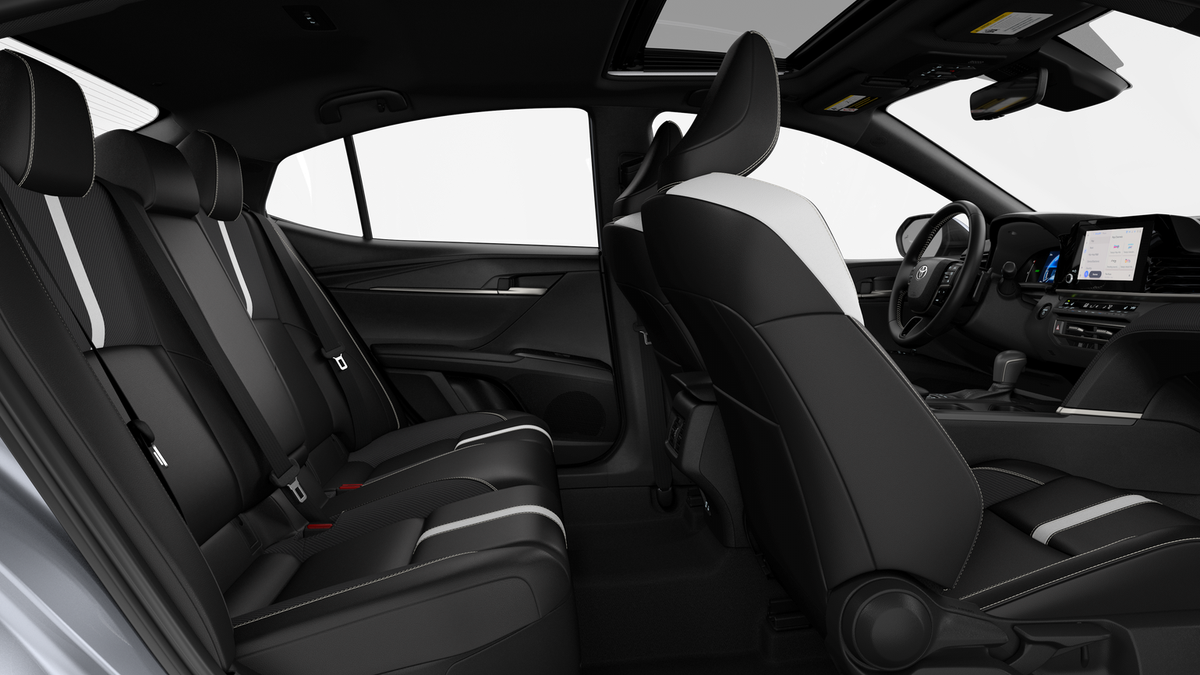Cold Weather Package (Heated Front Seats and Heated Leather Steering Wheel with Paddle Shifters), Convenience Package (Auto-Dimming Rearview Mirror with HomeLink and Smart Key System on Front Doors), Blk & Fabric Artificial Leather, 4-Wheel Disc Brakes, 6 Speakers, ABS brakes, Air Conditioning, All Weather Floor Protection, Alloy wheels, AM/FM radio: SiriusXM, Apple CarPlay/Android Auto, Auto High-beam Headlights, Automatic temperature control, Black Badge Overlays, Brake assist, Bumpers: body-color, Delay-off headlights, Driver door bin, Driver vanity mirror, Dual front impact airbags, Dual front side impact airbags, Electronic Stability Control, Emergency communication system: Safety Connect (5-year trial), Exterior Parking Camera Rear, Four wheel independent suspension, Front anti-roll bar, Front Bucket Seats, Front Center Armrest, Front dual zone A/C, Front reading lights, Front Seats, Fully automatic headlights, Heated door mirrors, Illuminated entry, Knee airbag, Leather Shift Knob, Leather steering wheel, Low tire pressure warning, Occupant sensing airbag, Outside temperature display, Overhead airbag, Overhead console, Panic alarm, Passenger door bin, Passenger vanity mirror, Power door mirrors, Power driver seat, Power steering, Power Tilt/Slide Moonroof, Power windows, Radio data system, Radio: 12.3 Toyota Multimedia Audio, Radio: 8 Toyota Audio Multimedia, Rear anti-roll bar, Rear reading lights, Rear seat center armrest, Rear window defroster, Remote keyless entry, Security system, SofTex and Fabric Seat Trim, Speed control, Speed-sensing steering, Split folding rear seat, Spoiler, Steering wheel mounted audio controls, Telescoping steering wheel, Tilt steering wheel, Traction control, Trip computer, Turn signal indicator mirrors, Variably intermittent wipers, and Wheels: 18 Multi-Spoke Black-Finished Alloy.