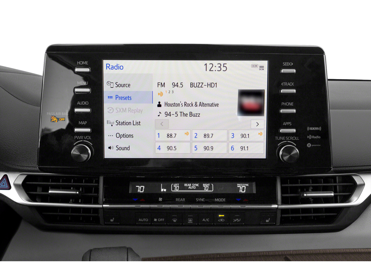 Toyota Gold Certified Certified, 17 Alloy Wheels, 3rd row seats: split-bench, 4-Wheel Disc Brakes, 8 Speakers, ABS brakes, Air Conditioning, Alloy wheels, AM/FM radio: SiriusXM, Apple CarPlay/Android Auto, Auto High-beam Headlights, Auto-dimming door mirrors, Auto-dimming Rear-View mirror, Automatic temperature control, Axle Ratio: TBA, Brake assist, Bumpers: body-color, Compass, Delay-off headlights, Door auto-latch, Driver door bin, Driver vanity mirror, Driver's Seat Mounted Armrest, Dual front impact airbags, Dual front side impact airbags, Electronic Stability Control, Emergency communication system: Safety Connect (3-year trial), Exterior Parking Camera Rear, Four wheel independent suspension, Front anti-roll bar, Front Bucket Seats, Front dual zone A/C, Front fog lights, Front Heated Bucket Seats, Front reading lights, Fully automatic headlights, Garage door transmitter: HomeLink, Heated door mirrors, Heated front seats, Illuminated entry, Knee airbag, Lane Departure Warning System, Leather Shift Knob, Leather steering wheel, Low tire pressure warning, Occupant sensing airbag, Outside temperature display, Overhead airbag, Overhead console, Panic alarm, Passenger door bin, Passenger seat mounted armrest, Passenger vanity mirror, Power door mirrors, Power driver seat, Power Liftgate, Power moonroof, Power passenger seat, Power steering, Power windows, Radio data system, Radio: Audio Plus, Rear air conditioning, Rear anti-roll bar, Rear dual zone A/C, Rear reading lights, Rear side impact airbag, Rear window defroster, Rear window wiper, Reclining 3rd row seat, Remote keyless entry, Roof Rails, SofTex Seat Trim, Speed control, Speed-sensing steering, Split folding rear seat, Spoiler, Steering wheel mounted audio controls, Tachometer, Telescoping steering wheel, Tilt steering wheel, Traction control, Trip computer, Turn signal indicator mirrors, and Variably intermittent wipers.